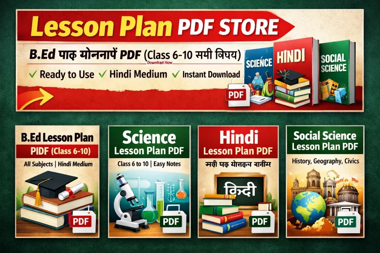 यहाँ उपलब्ध सभी Free Lesson Plan PDF in Hindi सरल हिंदी भाषा में, कक्षा-वार और विषय-वार ढंग से प्रस्तुत किए गए हैं, ताकि हर शिक्षक और प्रशिक्षु अपनी आवश्यकता के अनुसार सामग्री आसानी से चुन सके। साथ ही, micro teaching skills, teaching practice और परीक्षा-उपयोगी बिंदुओं को भी ध्यान में रखा गया है, जिससे यह सामग्री केवल पढ़ाने तक सीमित न रहे, बल्कि शिक्षक की संपूर्ण professional growth में सहायक बने।