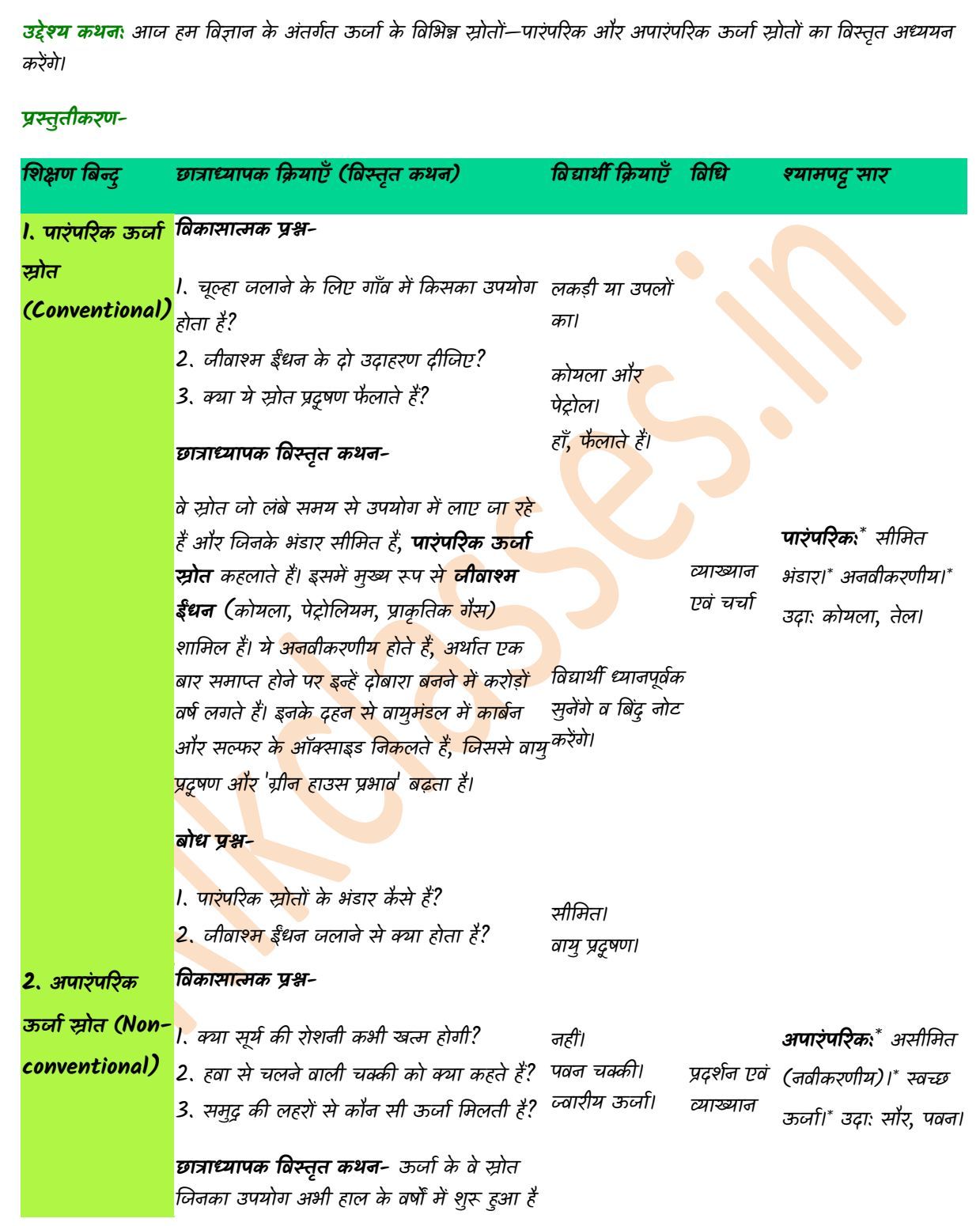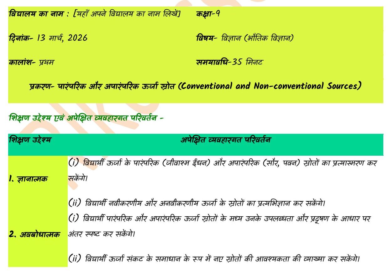 उद्देश्य कथन: आज हम विज्ञान के अंतर्गत ऊर्जा के विभिन्न स्रोतों—पारंपरिक और अपारंपरिक ऊर्जा स्रोतों का विस्तृत अध्ययन करेंगे।