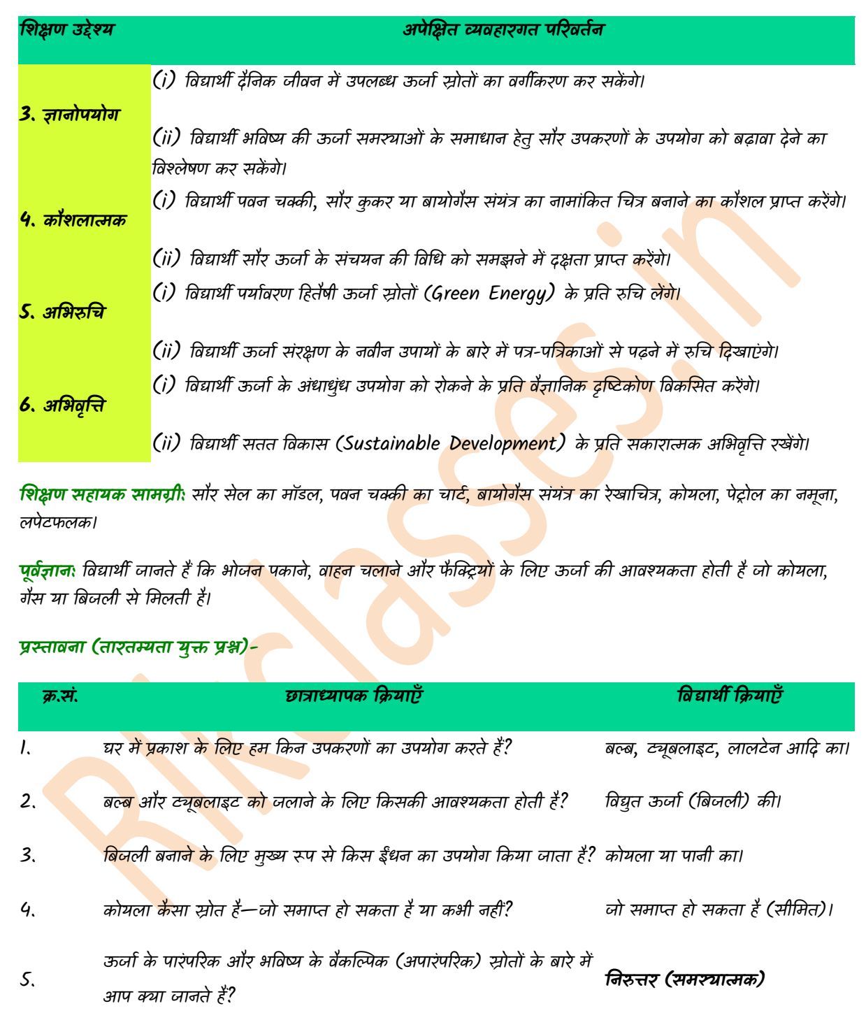 (i) विद्यार्थी पर्यावरण हितैषी ऊर्जा स्रोतों (Green Energy) के प्रति रुचि लेंगे। (ii) विद्यार्थी ऊर्जा संरक्षण के नवीन उपायों के बारे में पत्र-पत्रिकाओं से पढ़ने में रुचि दिखाएंगे। |