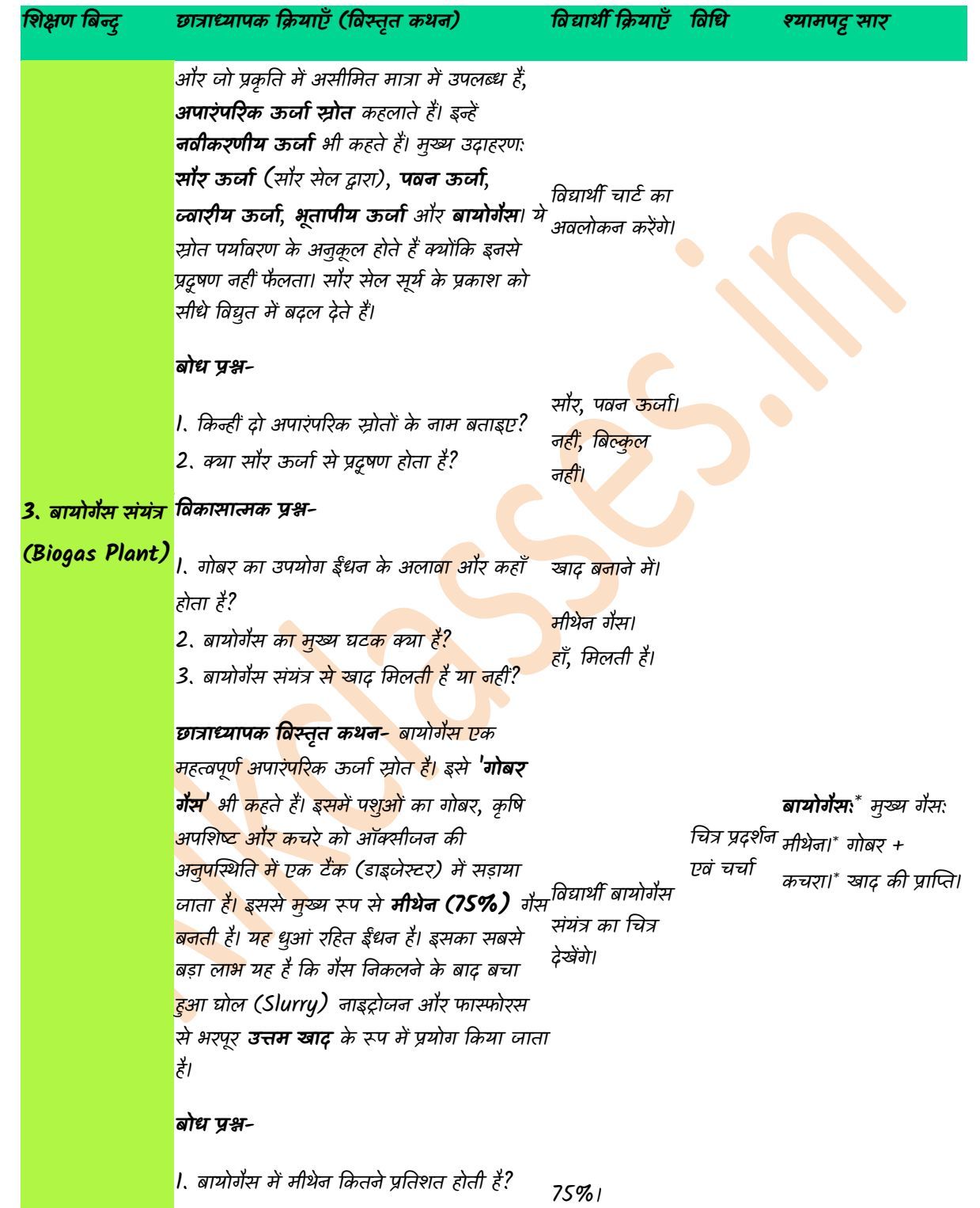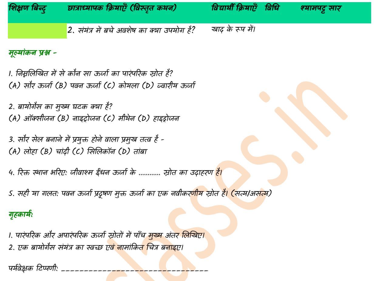 शिक्षण सहायक सामग्री: सौर सेल का मॉडल, पवन चक्की का चार्ट, बायोगैस संयंत्र का रेखाचित्र, कोयला, पेट्रोल का नमूना, लपेटफलक।