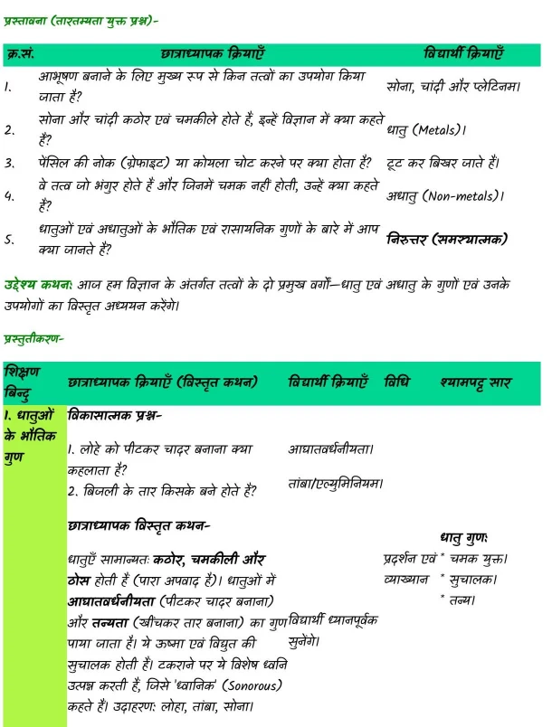 उद्देश्य कथन: आज हम विज्ञान के अंतर्गत तत्वों के दो प्रमुख वर्गों—धातु एवं अधातु के गुणों एवं उनके उपयोगों का विस्तृत अध्ययन करेंगे।