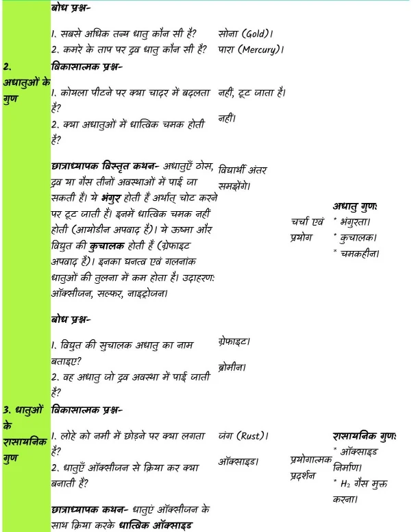 छात्राध्यापक विस्तृत कथन- अधातुएँ ठोस, द्रव या गैस तीनों अवस्थाओं में पाई जा सकती हैं। ये भंगुर होती हैं अर्थात् चोट करने पर टूट जाती हैं। इनमें धात्विक चमक नहीं होती (आयोडीन अपवाद है)। ये ऊष्मा और विद्युत की कुचालक होती हैं (ग्रेफाइट अपवाद है)। इनका घनत्व एवं गलनांक धातुओं की तुलना में कम होता है। उदाहरण: ऑक्सीजन, सल्फर, नाइट्रोजन।