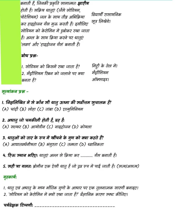छात्राध्यापक कथन- धातुएं ऑक्सीजन के साथ क्रिया करके धात्विक ऑक्साइड बनाती हैं, जिनकी प्रकृति सामान्यतः क्षारीय होती है। सक्रिय धातुएं (जैसे सोडियम, पोटेशियम) जल के साथ तीव्र अभिक्रिया कर हाइड्रोजन गैस मुक्त करती हैं। इसीलिए सोडियम को केरोसिन में डुबोकर रखा जाता है। अम्ल के साथ क्रिया करने पर धातुएं ‘लवण’ और ‘हाइड्रोजन गैस’ बनाती हैं।